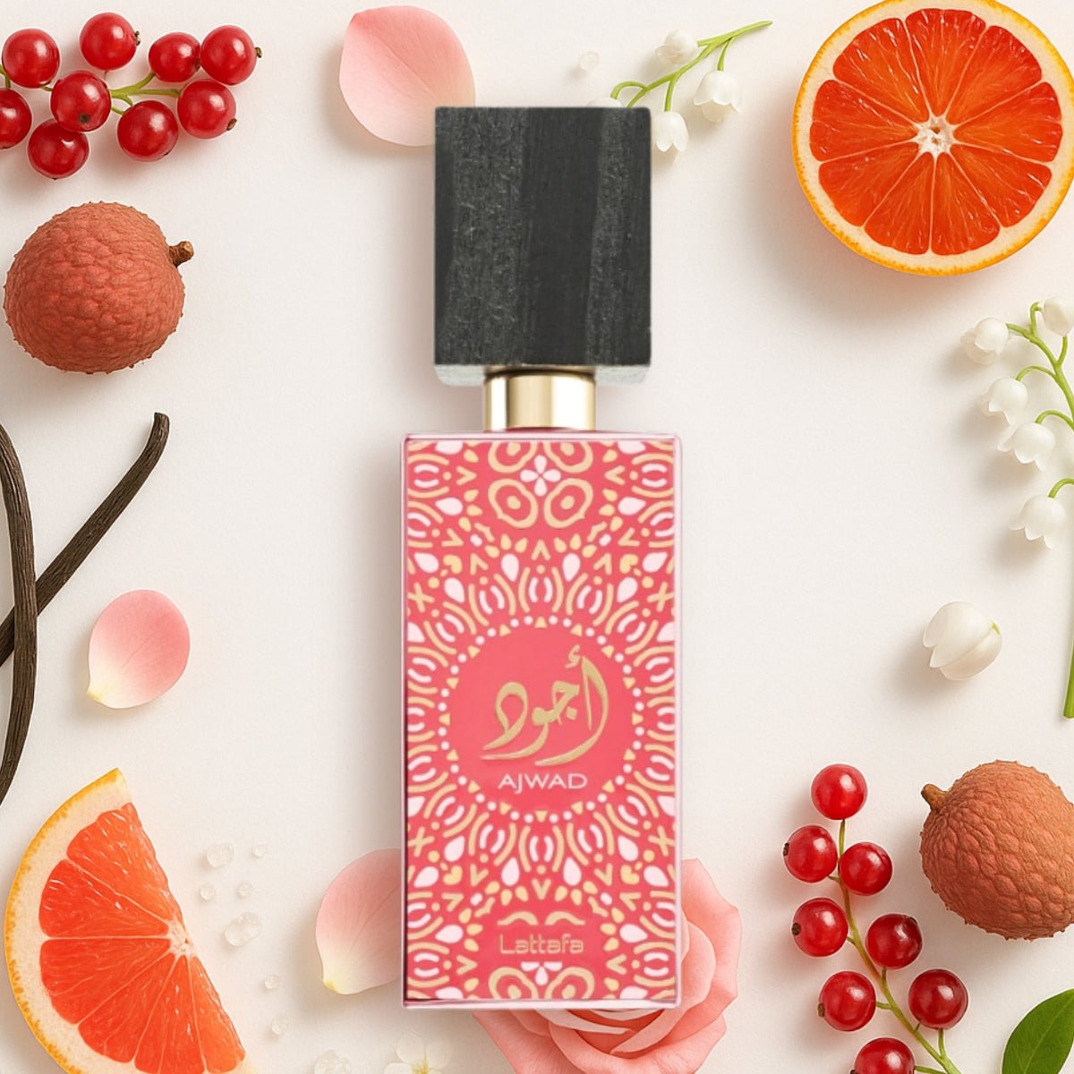 Discover Ajwad Pink To Pink Eau de Parfum, a unisex fragrance with captivating notes of Red Fruits, Lychee & Gourmet Blood Orange. This elegant and fresh fragrance is suitable for all occasions. ✨