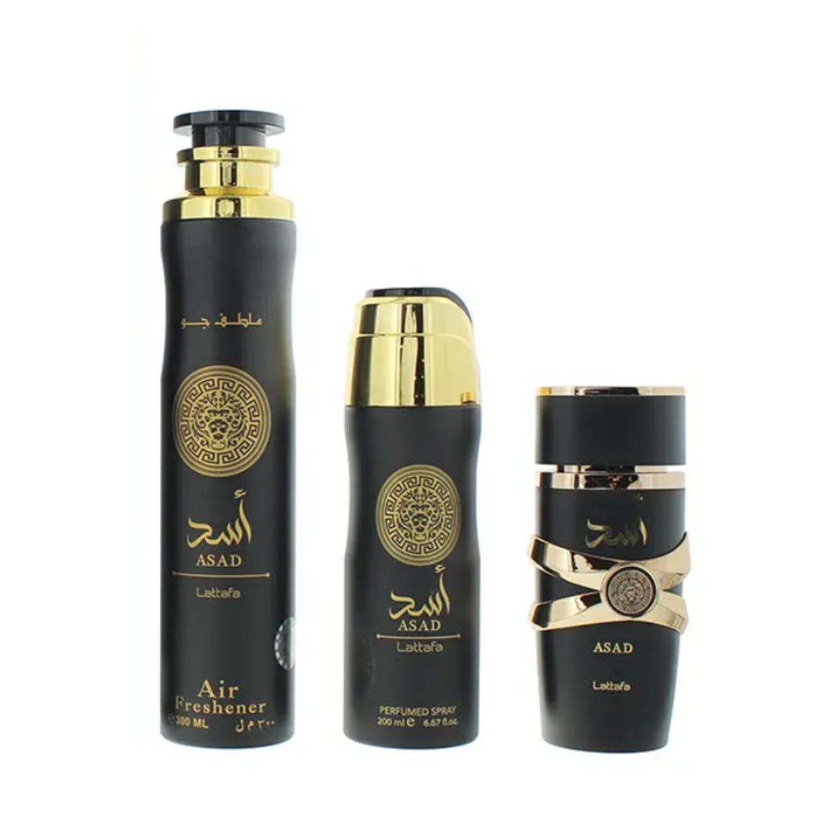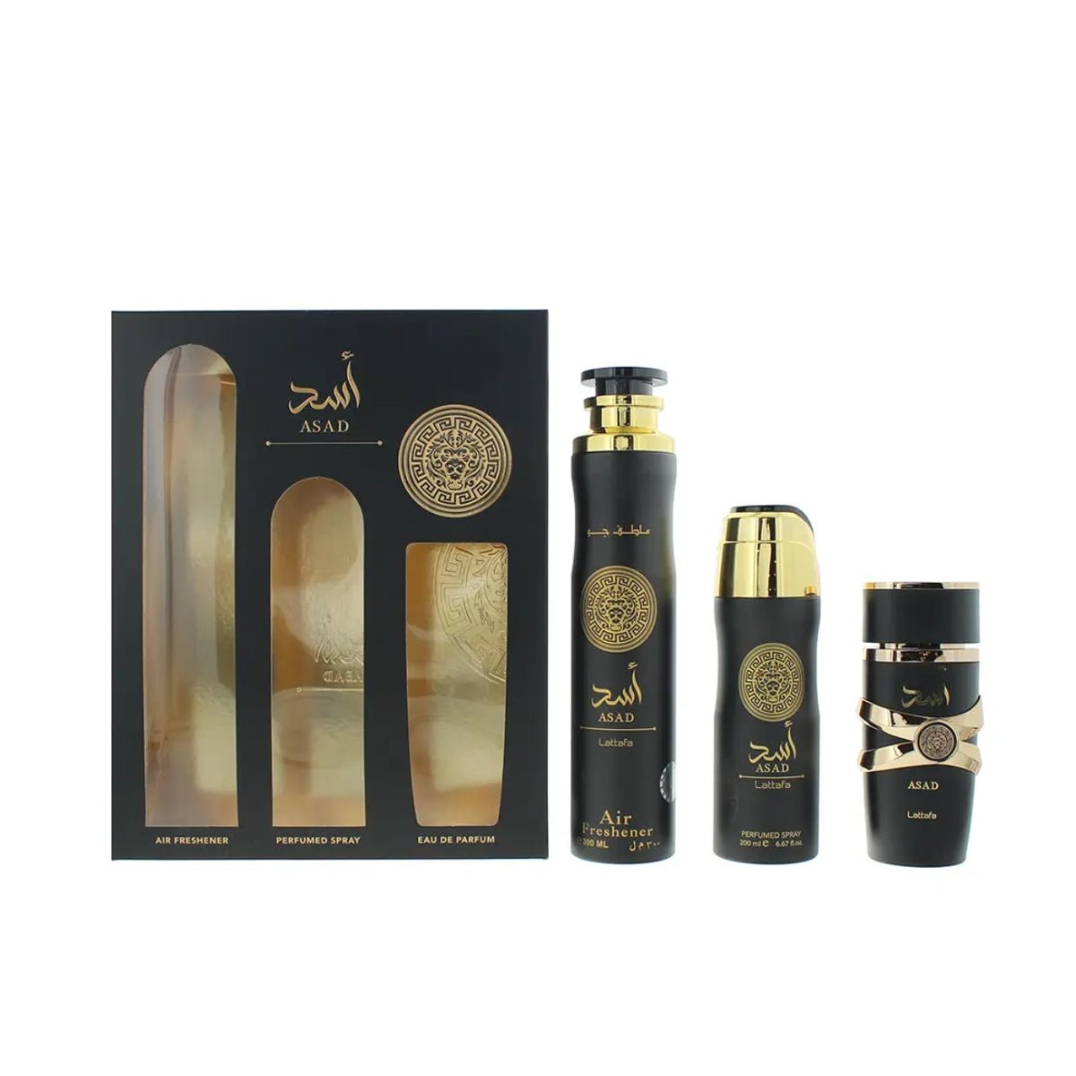 Asad Lattafa Gift Set: 1 x 100ml perfume, 1 x 200ml scented body spray, 1 x 300ml air freshener 🫐