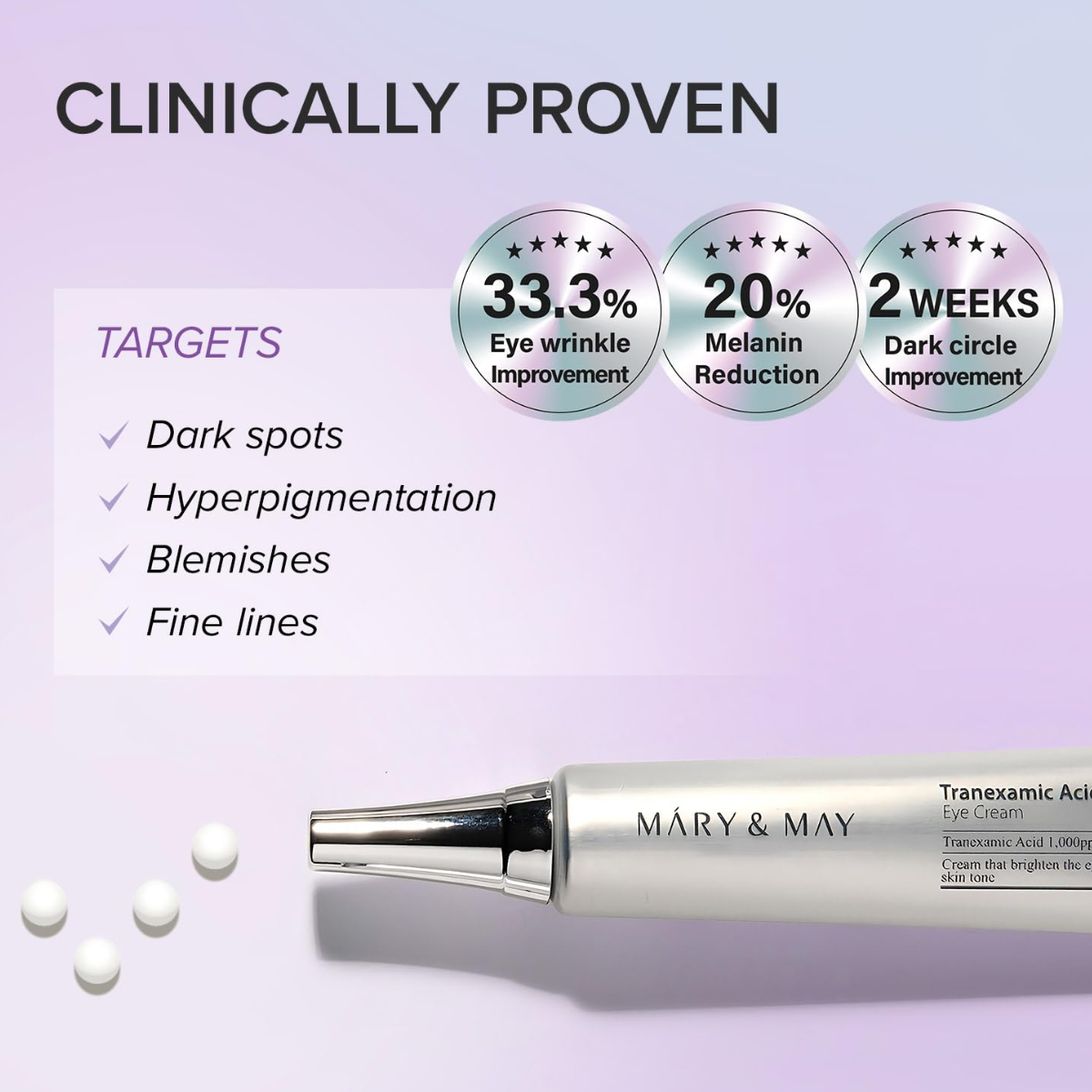 Mary&May Eye Contour Cream with Tranexamic Acid and Glutathione is specially formulated to provide intensive care for the delicate skin around the eyes, helping to reduce dark areas and even out skin tone for a brighter and more revitalized eye area. Whether due to short nights, stress, or daily loss of skin firmness, this cream provides targeted care for an eye contour that is brighter, firmer, and visibly healthier. Its soft and emollient texture absorbs easily into the skin, leaving no greasy or heavy film, and offering a pleasant feel with each application. To be used morning and evening, gently massaging to promote absorption and restore the eye contour to a firmer, plumper appearance. Regular use helps to achieve a smoother and brighter eye contour, with dark circles and shadowed areas visibly reduced. The eyes look more lively and rested, while each application becomes a true skincare experience, bringing health and vitality to the delicate skin around the eyes and revealing a confident and radiant gaze.