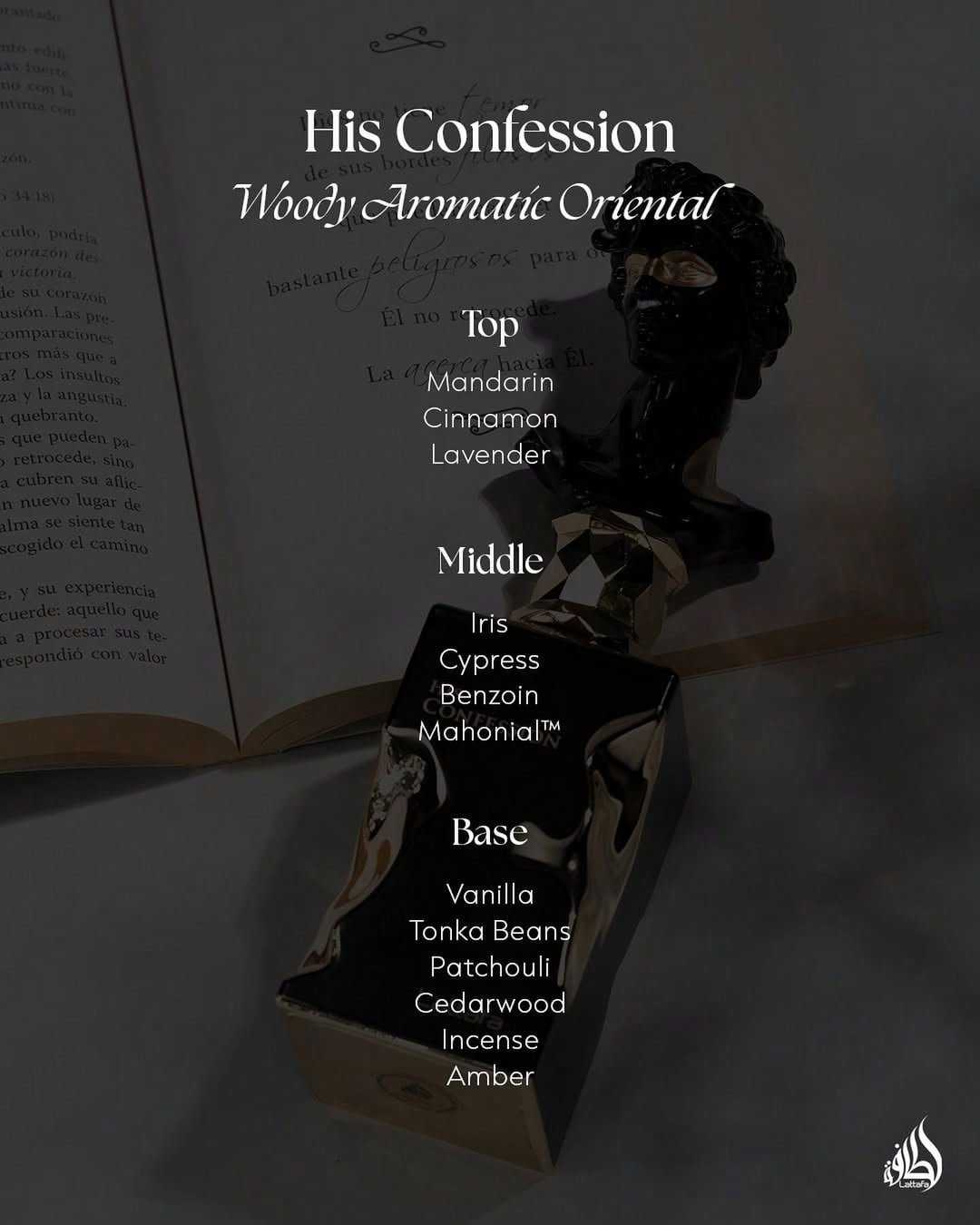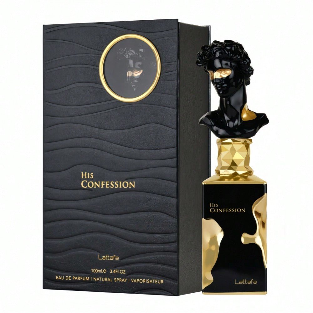 Discover His Confession by Lattafa, a woody oriental fragrance specially designed for the modern man. This perfume opens with spicy notes of cinnamon, lavender, and mandarin, bringing freshness and character. The heart reveals refined accords of iris, benzoin, and cypress, adding depth and elegance. In the base, sensual notes of vanilla, tonka bean, incense, amber, cedar, and patchouli create a captivating trail. His Confession is presented in an artistic bottle, a true sculpture, reflecting the intensity and refinement of this unique fragrance.