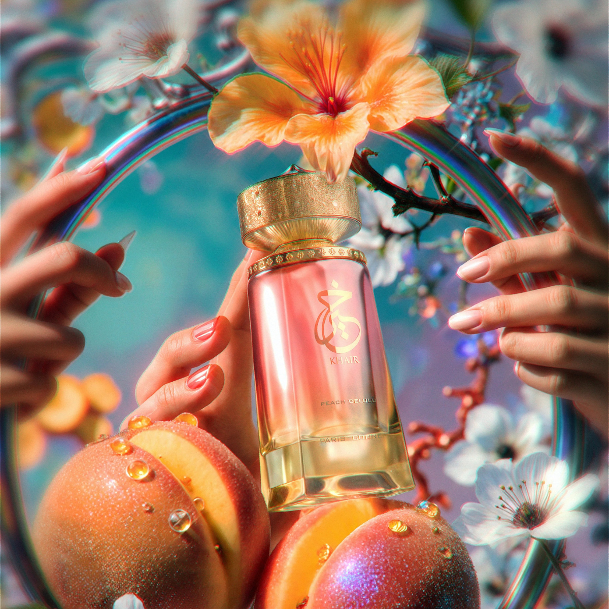 🌟 KHAIR PEACH DELULU is an olfactory experience that transcends reason. The top notes reveal the juicy sweetness of peach and nectarine, intertwined with the exotic freshness of guava, creating a fruity ascent that is almost hallucinatory. At the heart, spicy ginger and warm cardamom awaken the senses, while rose adds a touch of delicate romance. In the base, the gourmand roundness of caramel unites with the sensuality of musk, enriched by the woody depth that provides intensity and longevity to the whole.