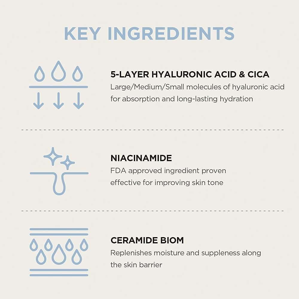 Purified Water, Centella Asiatica Leaf Water(38%), Butylene Glycol, 1,2-Hexanediol, Niacinamide, Glycerin, Pantolactone, Hibiscus Esculentus Fruit Extract, Sodium Hyaluronate, Hydrolyzed Hyaluronic Acid, Hyaluronic Acid, Methylpropanediol, Panthenol, Cetearyl Olivate, Carbomer, Arginine, Sorbitan Olivate, Caprylic/Capric Triglyceride, Pyrus Communis (Pear) Fruit Extract, Pentylene Glycol, Adenosine, Polyglutamic Acid, Rosa Damascena Flower Water, Artemisia Princeps Leaf Extract, Cucumis Melo (Melon) Fruit Extract, Iris Florentina Root Extract, Ethyl Hexyl Glycerin, Hedera Helix (Ivy) Leaf/Stem Extract, Sodium Phytate, Xanthan Gum, Maltodextrin, Hydrolyzed Gardenia Florida Fruit Extract, Hydrogenated Lecithin, Ceramide-NP, Sodium Hyaluronate Crosspolymer, Hydrolyzed Sodium Hyaluronate.