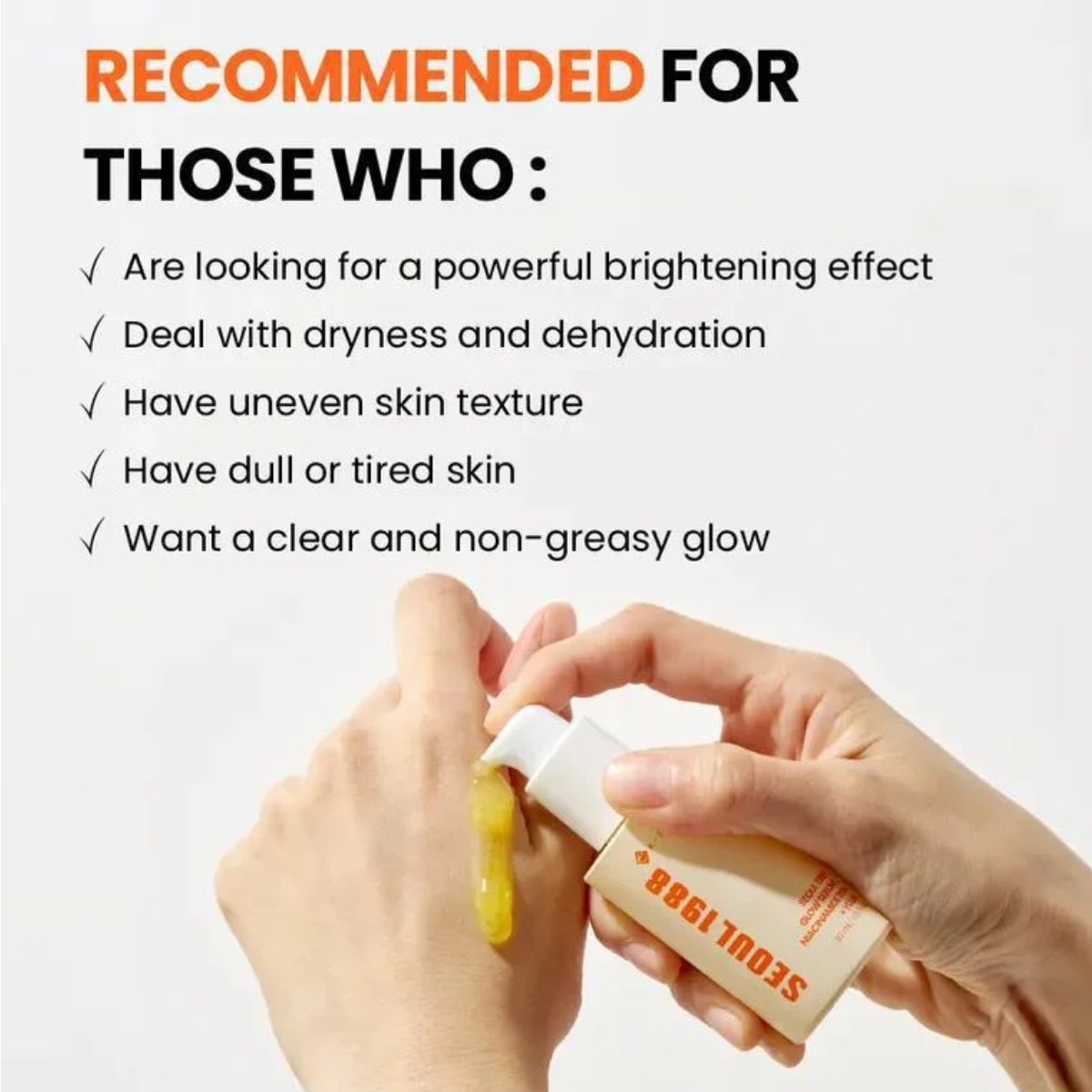 Illuminate your skin and say goodbye to dullness. SEOUL 1988 Glow Serum: Niacinamide 15% + Yuja combines a high concentration of niacinamide with yuja extract to deliver a visible brightening effect, improve hyperpigmentation, dullness and uneven texture, and reveal a naturally radiant complexion. Its lightweight, easily absorbed texture incorporates hydrating and antioxidant agents, providing comfort, nourishment, and barrier protection. After application, the skin appears soft, luminous and visibly healthier. Suitable for all skin types, including sensitive skin. For a daily ritual, apply a moderate amount after cleansing and toning to the face and neck, then pat gently until fully absorbed. Regular use helps even out the complexion and reveal renewed radiance, turning each application into a moment of dedicated care. Best used in the evening, and remember to apply sunscreen in the morning for a radiant and protected complexion throughout the day. Gradually, you’ll notice brighter, more even skin that looks revitalized.