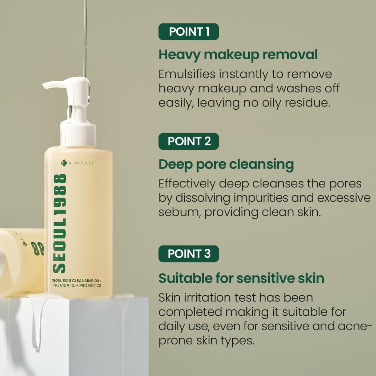 A cleansing oil infused with a pine-based complex and Centella Asiatica, as well as probiotics, that effectively removes impurities without irritating the skin. 🧴