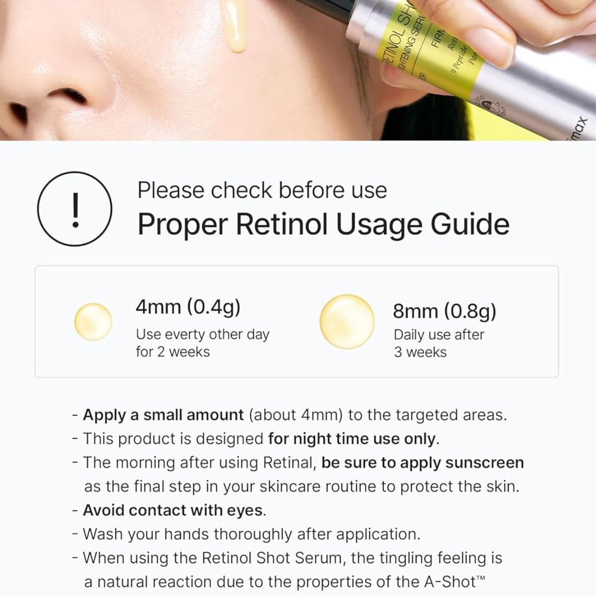 If you are new to retinol, start gradually. For the first two weeks, apply the serum every other night after cleansing. Use a small amount — about the size of a grain of rice — on the desired areas. After about three weeks, when the skin has adjusted, apply it every night over the entire face in a thin, even layer. Since retinol can make the skin more sensitive to the sun, it is advisable to apply sunscreen the following morning.