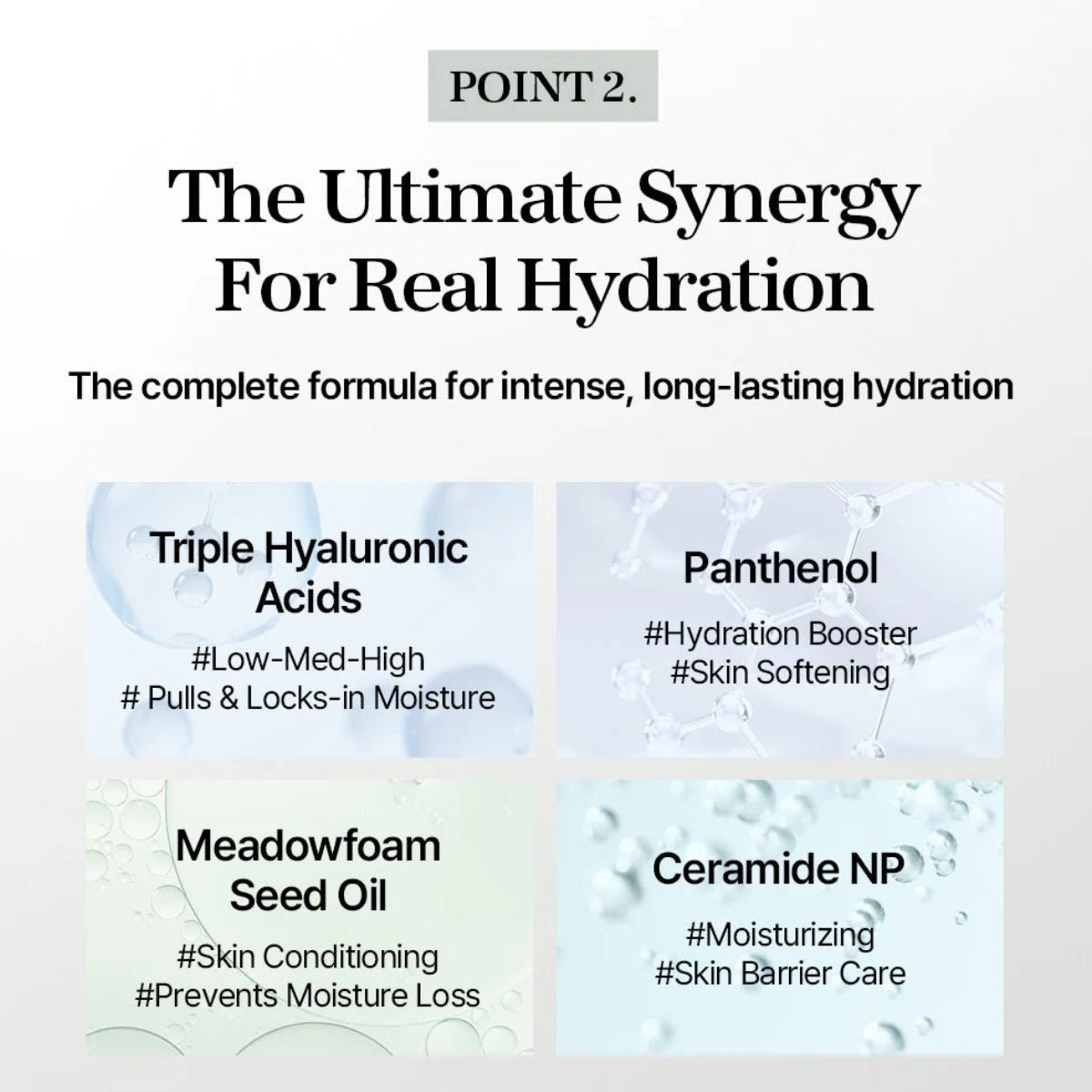 Water, Butylene Glycol, Glycerin, Dipropylene Glycol, Saccharomyces/Rice Ferment Filtrate, 1,2-Hexanediol, Limnanthes Alba (Meadowfoam) Seed Oil, Microcrystalline Cellulose, Pentylene Glycol, Panthenol, Cellulose Gum, Allantoin, Ethylhexylglycerin, Acrylates/C10-30 Alkyl Acrylate Crosspolymer, Diphenyl Dimethicone, Triethylhexanoin, Polyglyceryl-3 Methylglucose Distearate, Disodium Edta, Hydrogenated Lecithin, Polyglyceryl-10 Myristate, Methyl Glucose Sesquistearate, Cetearyl Glucoside, Bifida Ferment Lysate, Lactobacillus Ferment Lysate, Streptococcus Thermophilus Ferment, Tocopherol, Sodium Hyaluronate, Sodium Ascorbyl Phosphate, Ceramide NP, Hydroxypropyltrimonium Hyaluronate, Hydrolyzed Hyaluronic Acid, Sodium Acetylated Hyaluronate, Potassium Hyaluronate, Sodium Hyaluronate Crosspolymer, Hydrolyzed Sodium Hyaluronate, Hyaluronic Acid.