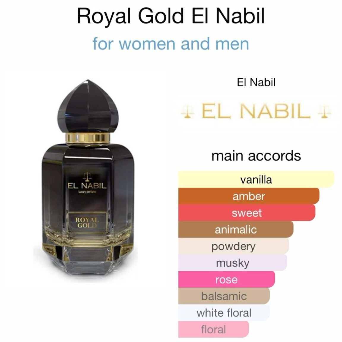 Nous vous proposons aujourd’hui El Nabil Royal Gold, un parfum sensuel et sophistiqué par excellence, tantôt doux et subtil, tantôt acidulé et trépidant. Le Royal Gold El Nabil dégage un sillage euphorisant et débordant d’énergie. D’une senteur captivante et irrésistible, le quotidien rime à la fois avec fantaisie et luxe à la portée de tous !